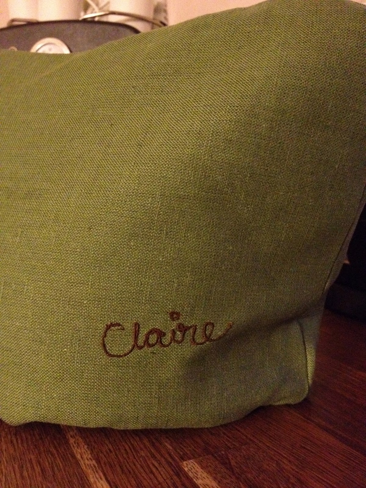 I must say that the bit I am most proud of is my name, I had one attempt on a scrap piece of fabric before launching into my lovely linen and hoping that I didn't go wrong and spoil the fabric, but here it is a real Ta-Dah, it looks great and just finishes it off to show that it is all my own work :)